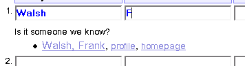 Then user may click on any of the suggested personal names and it will mean he made a choice. Script will then fill out the Family and Given name fields and personal identifier field. Other links ("profile", "homepage") may help the user to find more information about the person in question.